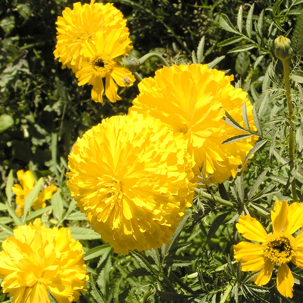 - Descripción: Planta anual herbácea, aromática, de hasta 60cm de alto. Flores grandes muy rellenas amarillas.