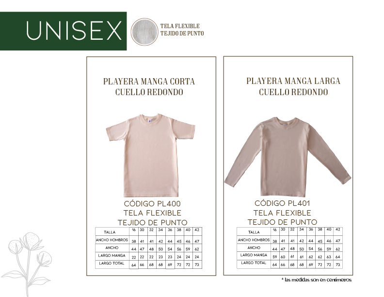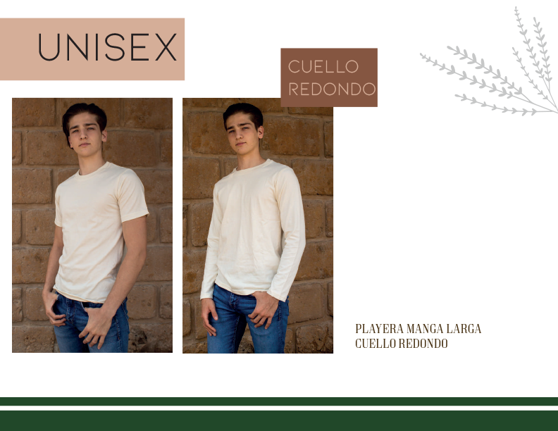 Playera de manga larga y cuello redondo unisex confeccionada en tela de algodón 100% natural.