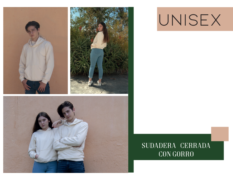 Sudadera cerrada con gorro unisex confeccionada en tela de algodón 100% natural.